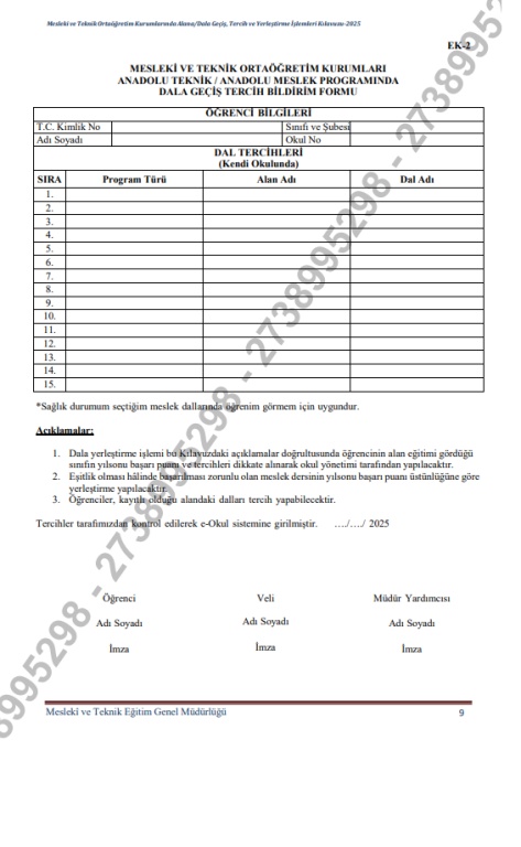 Not: Tercihlerini e-okul üzerinden yapamayan velilerimiz tercihlerin okul idaresi tarafından sisteme girişinin yapılması için "alana geçiş tercih bildirim formu"nu doldurup okulumuza bildirmesi gerekmektedir.