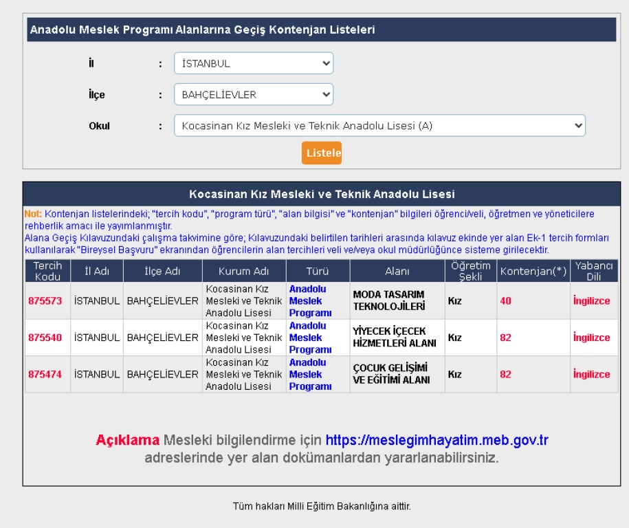 875474 | İSTANBUL | BAHÇELİEVLER | Kocasinan Kız Mesleki ve Teknik Anadolu Lisesi | Anadolu Meslek Programı | ÇOCUK GELİŞİMİ VE EĞİTİMİ ALANI | Kız | 82 | İngilizce |
